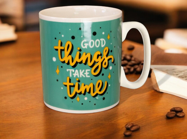 💚 Дизайн кружки поєднує ніжний зелений колір з красивим мотиваційним написом, що нагадує про те, що все хороше вимагає часу. Якісна кераміка гарантує довговічність, а зручна ручка робить використання максимально комфортним.