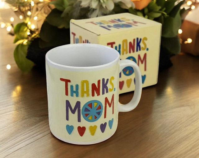💖 Скажіть мамі "дякую" оригінальним способом! Кружка "Thanks Mom" створена для того, щоб висловити любов і вдячність. Яскраві літери та кольорові сердечка роблять дизайн особливо теплим і радісним.